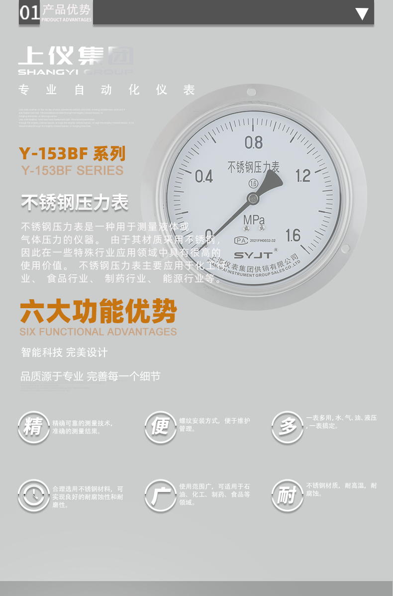 上仪集团Y-153BF轴向带边不锈钢压力表,不锈钢压力表广泛用于石油、化工、化纤、冶金、电站等工业部门中对耐腐、抗振有较高要求的工艺流程中测量各种流体介质的压力。
