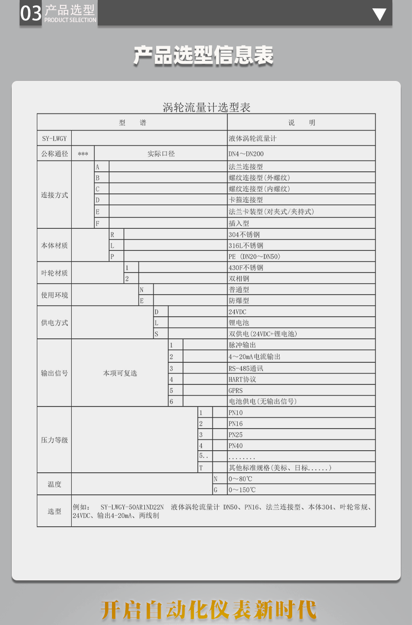 例如,选用一台法兰连接式防爆型涡轮流量计测量水,需要现场显示并远传4-20mA信号,管道为DN40,要求精度0.5级,304不锈钢材质,仪表耐压16MPa测量范围为标准量程,其产品型号应为:SY-LWGY-40(FL)C/05/S/S/E/H16