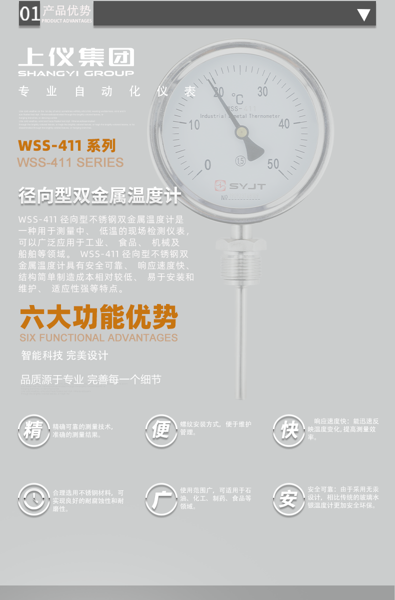 WSS 不锈钢双金属温度计 径向型,本厂生产的双金属温度计其保护管、节头、锁紧螺栓等均采用1Cr18Ni9Ti材料,表壳采用铝板拉伸成型经切削加工表面黑色电泳处理,表盖与表盒采用环型双层橡胶圈螺纹密封锁紧结构,故仪表整体防水防腐性能良好,径向型仪表采用弯管型结构,外型新颖、轻巧、美观与众不同。